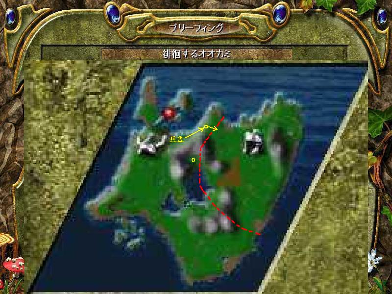 開拓方向は本拠地から南に広範囲、そして北側海岸沿いに東方向へ。 前者は木や石を切り開きながら有用な土地を確保する感じで。 後者は敵領地と隣接するのでMAP北側中央の海に突き出した部分を拠点にする。 またある程度安定してからになるが敵の侵攻が本拠地に喰い込んで来る可能性がある。 MAP中央湖の北側盆地辺りに“監視塔”を建てておくと良い。