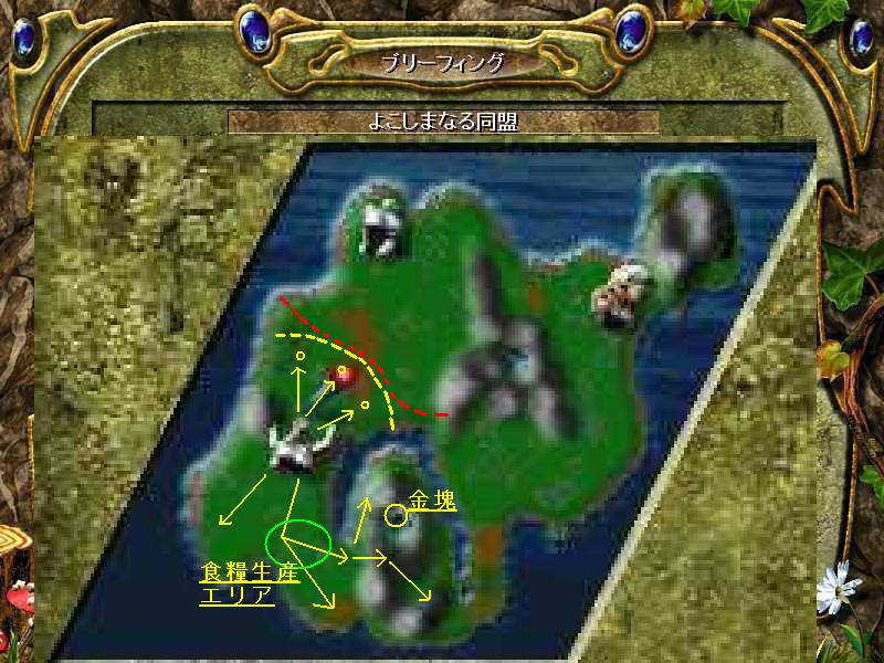 北方と南方に領地を拡大しつつ西側の小山で石炭/鉄鉱石を採掘して増兵を進める。 “川”は本拠地南側にあり“V2■徘徊するオオカミ”同様に地形が悪いので、適当に妥協した場所で食糧生産を行う。 またその“川”の東側にはクレーター型の山脈があり、ここの地下資源はかなりあてに出来る。 そしてこのクレーターには金が42個も落ちていたりするので適当に利用する。防衛線は北側のローマとの国境になり、監視塔3つぐらいでローマの侵攻(塔による領土拡大)を防ぐ必要がある。