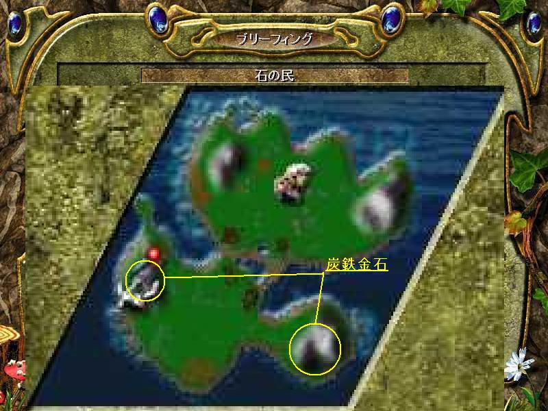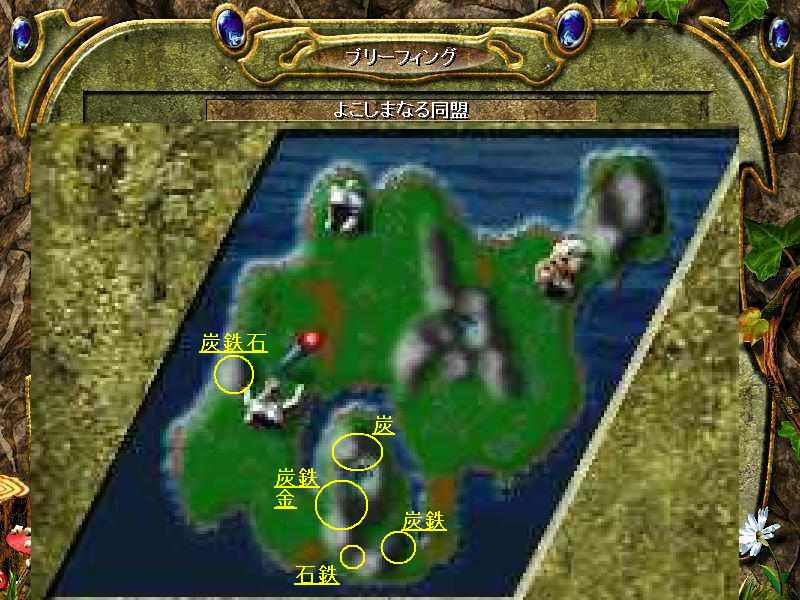開拓方向は本拠地から南に広範囲、そして北側海岸沿いに東方向へ。 前者は木や石を切り開きながら有用な土地を確保する感じで。 後者は敵領地と隣接するのでMAP北側中央の海に突き出した部分を拠点にする。 またある程度安定してからになるが敵の侵攻が本拠地に喰い込んで来る可能性がある。 MAP中央湖の北側盆地辺りに“監視塔”を建てておくと良い。