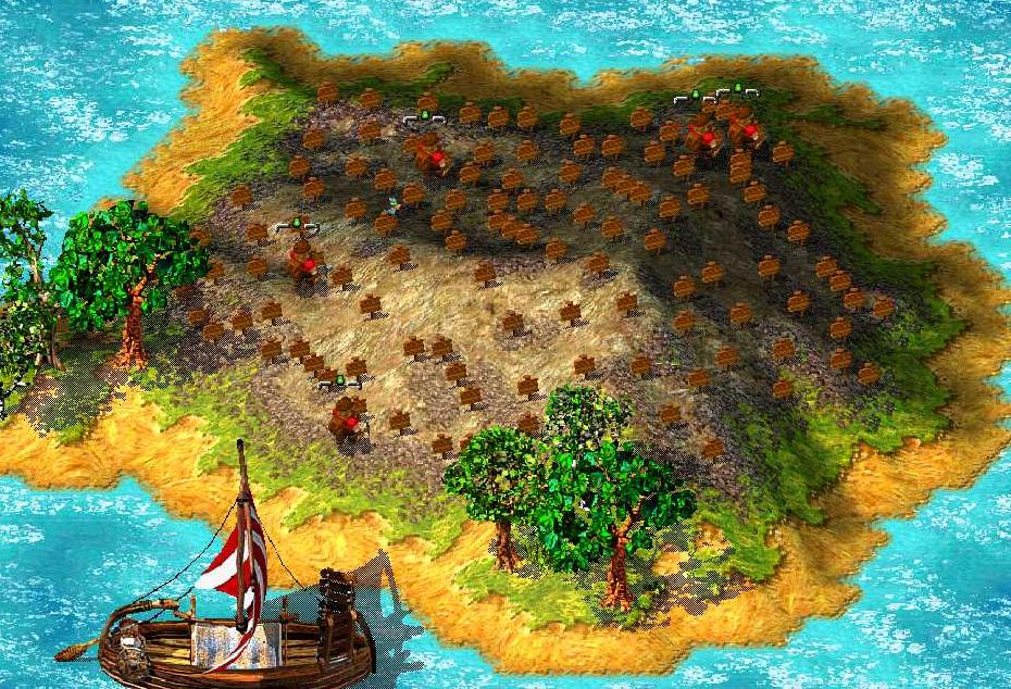 マヤのパトロール兵が極端に減ってきたら終盤に突入。 岬に弓兵100を残したまま弓兵100+αでマヤ本土を蹂躙する。 敵兵舎は“兵がフルで駐留する塔”のそばにあるので兵舎の制圧は無理。 適当な場所で迎え撃つようにする。