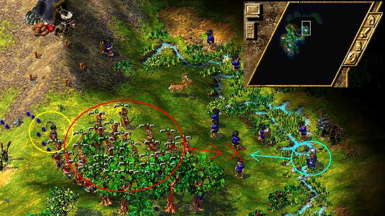 そして既存の兵を合流させ進軍。弓兵を前面に立たせてうまく立ち回ると敵のパトロール兵を全滅させる事が出来、且つ敵が2つの小山(鉱山)を領土化しているので、それを奪えば敵が沈黙します。この時に自軍の剣士全滅=失敗です。